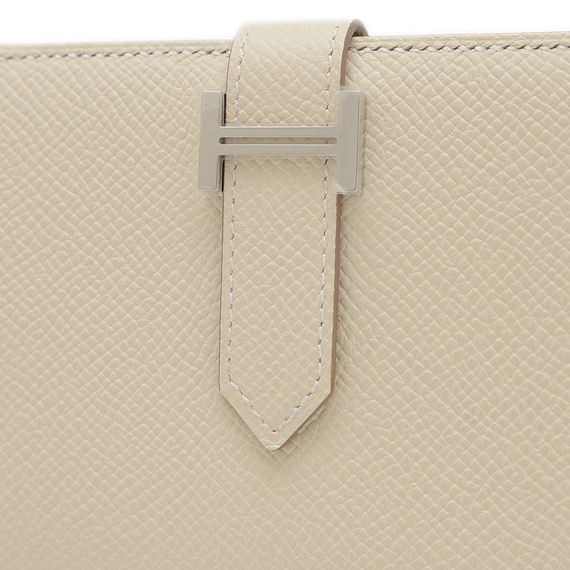 - コンパクトながらも収納力と機能性を兼ね備えた二つ折り財布です。傷に強く型崩れしにくいヴォー・エプソン素材の上品なクレ(淡いオフホワイト)カラーに、クールなシルバーのH金具が洗練されたアクセントになっています。内側には札入れ、小銭入れ、複数のカードスロットを備え、日常使いに最適なエレガントな逸品です。