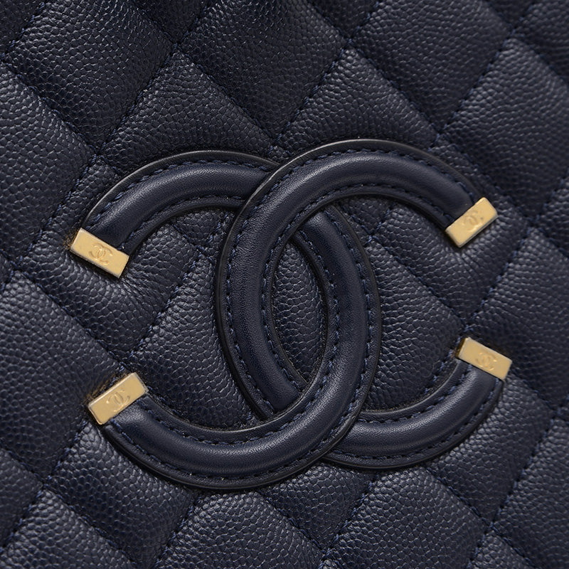 傷に強いキャビアスキン素材のシックなネイビーカラーが特徴のショルダーバッグです。ふっくらとしたマトラッセステッチに、CCロゴと繊細なフィリグリー(装飾)が施された留め具がエレガントなアクセントになっています。日常の必需品をスマートに収納できるサイズ感で、クラシックな魅力と現代的なデザインを兼ね備えた人気の逸品です。