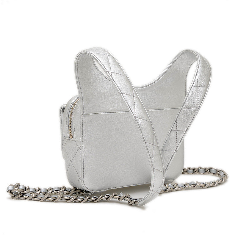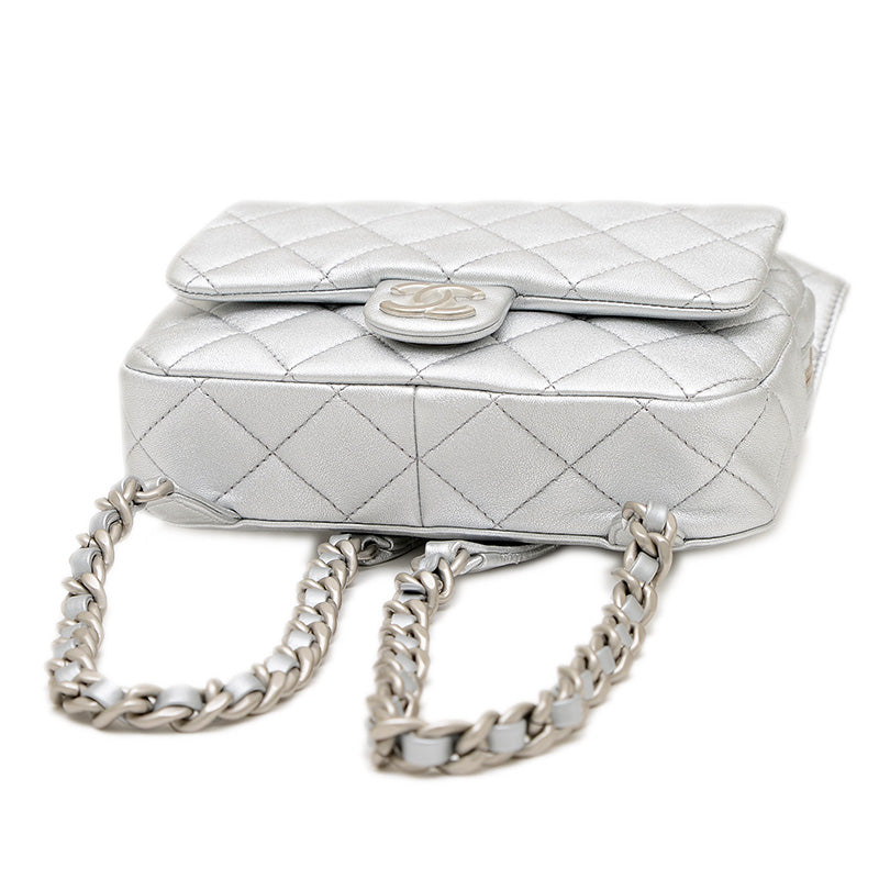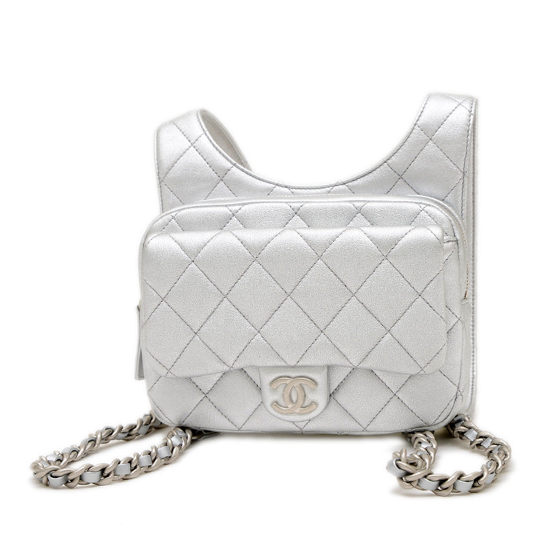 - ふっくらとしたキルティングが施されたメタリックシルバーカラーのレザーが特徴的なバックパックです。クールなシルバー金具と、アイコニックなCCロゴのクラスプがエレガントなアクセントになっています。コンパクトなサイズ感ながら、日常の必需品を収納できる実用性を備え、カジュアルなアイテムながらもシャネルらしい洗練された高級感を演出する人気の逸品です。