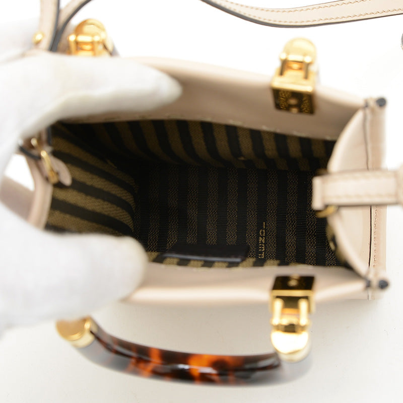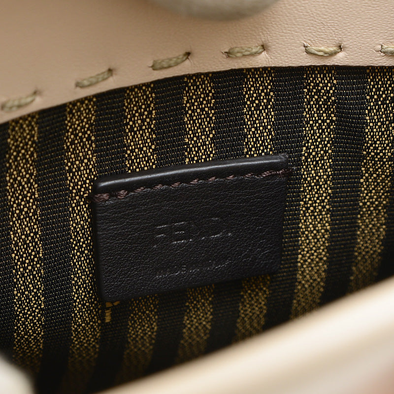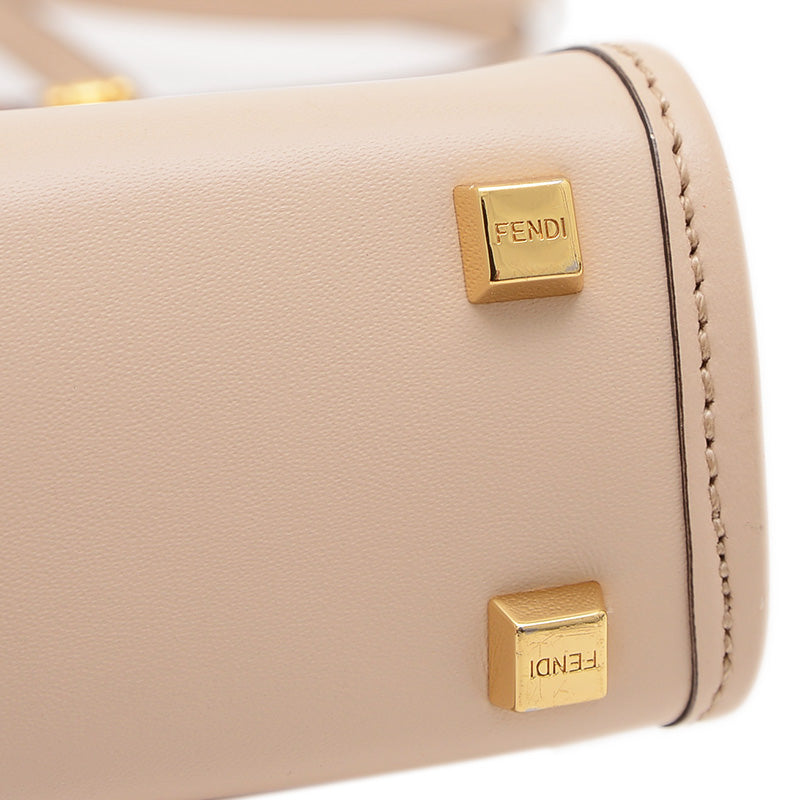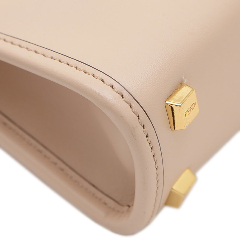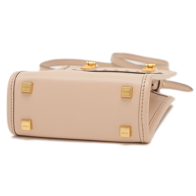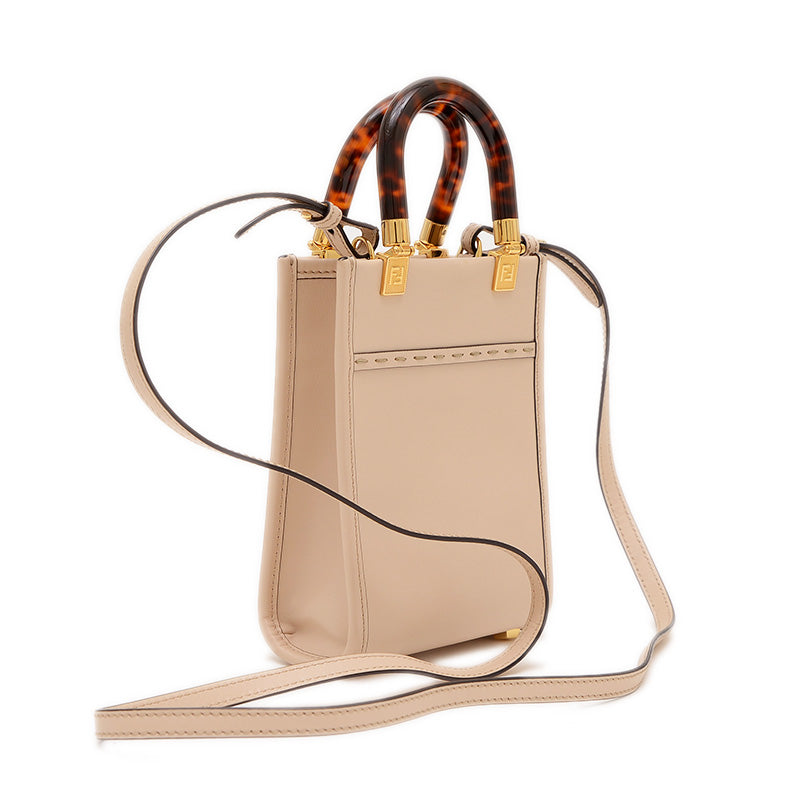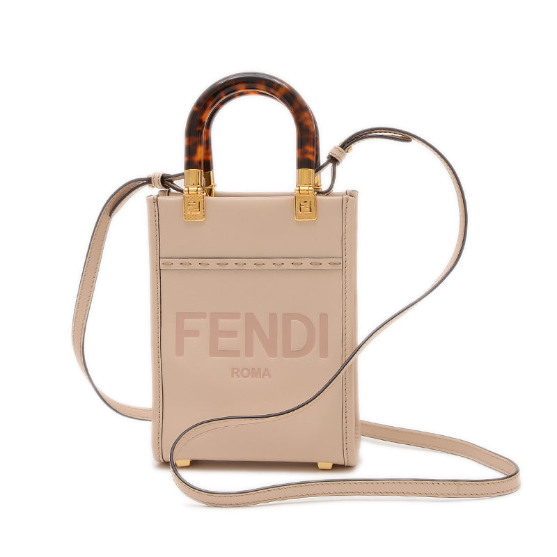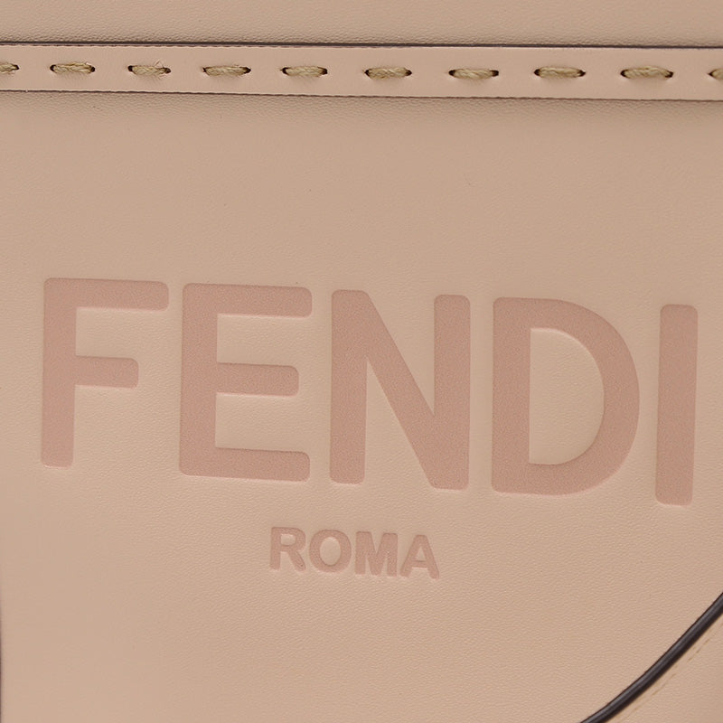 上質なレザーの落ち着いたベージュカラーと、コンパクトなミニトートフォルムが特徴的なバッグです。サイドに配された「FENDI ROMA」のロゴが目を引くデザインで、かっちりとした縦長シルエットが洗練された印象を与えます。トップハンドルと取り外し可能なショルダーストラップにより、手持ちとしてもクロスボディとしても楽しめる人気の逸品です。