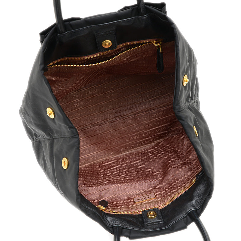 - 軽量で耐久性に優れたテスートナイロン素材のシックなブラックカラーが特徴のトートバッグです。かっちりとしたフォルムと、プラダの象徴的なトライアングルロゴプレートが洗練された印象を与えます。マグネット開閉式で内側に複数のファスナーポケットを備え、日常使いに最適なサイズ感と機能性を兼ね備えた人気の逸品です。