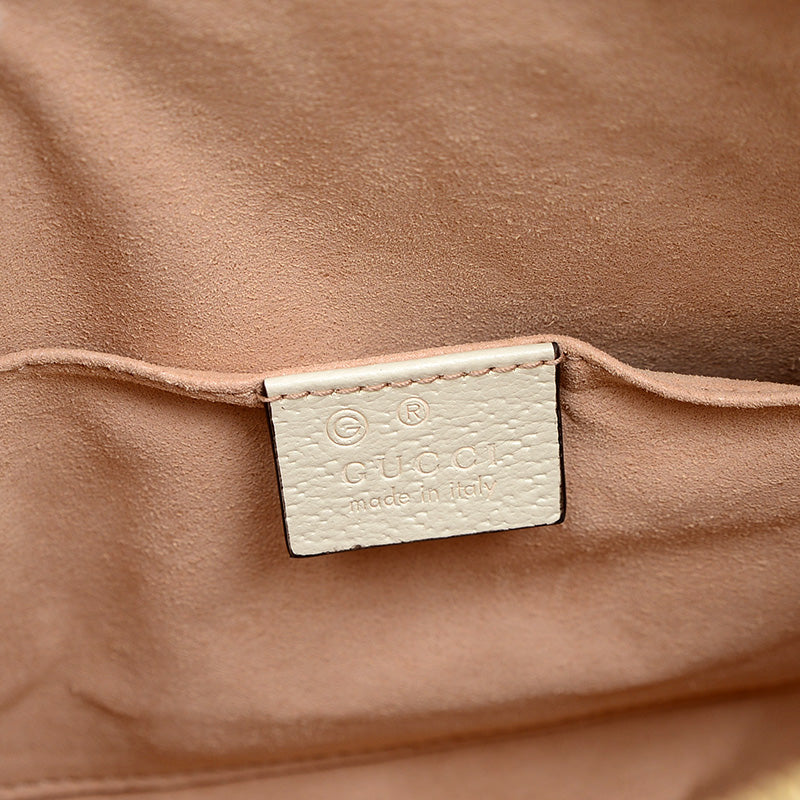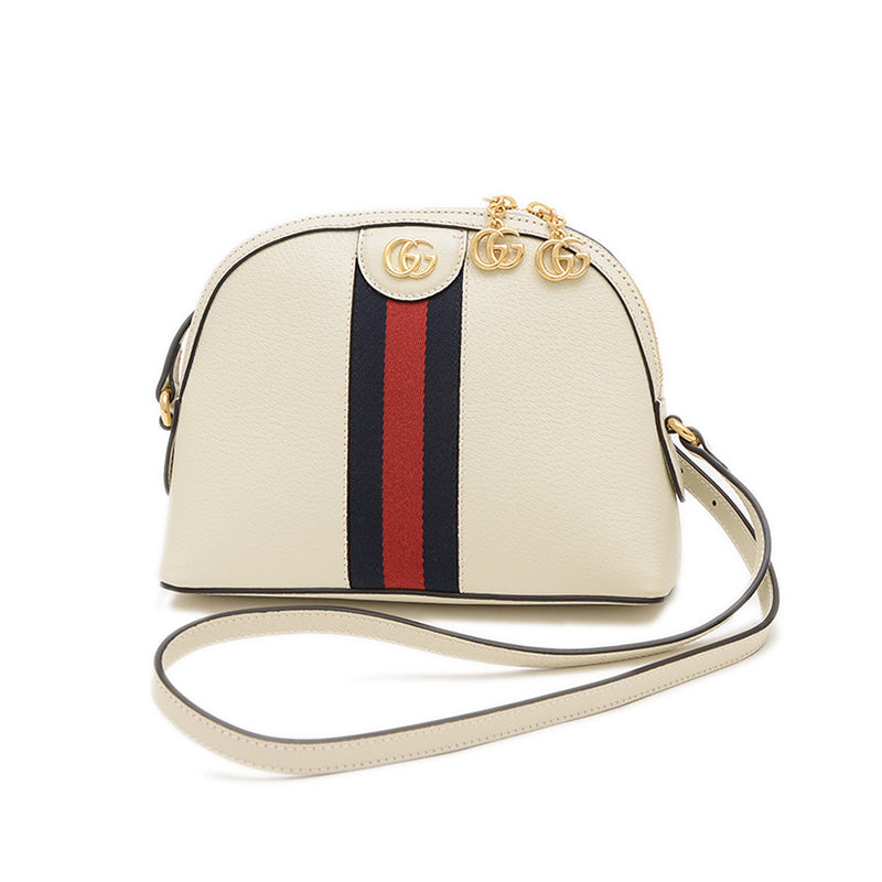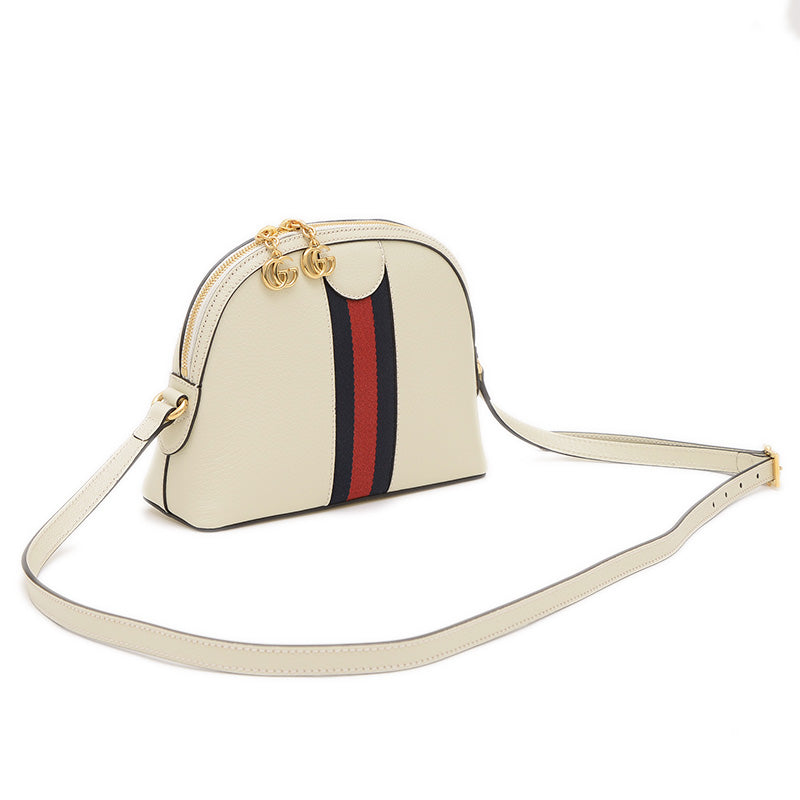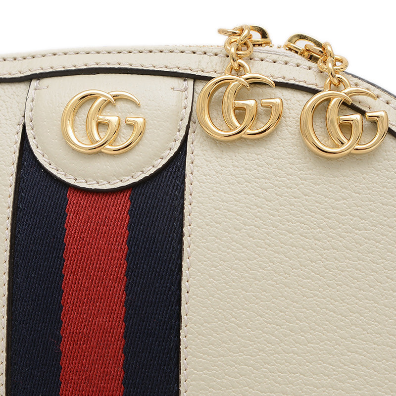 - 上質なレザーのクリーンなホワイトカラーが特徴的な、ドーム型のコンパクトなショルダーバッグです。グッチの象徴であるダブルGロゴと、グリーン・レッド・グリーンのウェブストライプという2つのアイコニックなモチーフが組み合わされています。ダブルファスナー式開閉と複数の内ポケットがあり、実用性も兼ね備えた、エレガントでタイムレスな人気の逸品です。